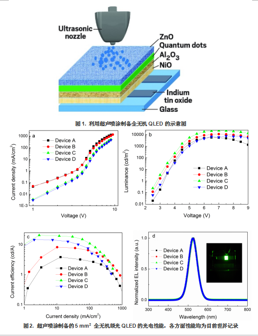 张汉壮、纪文宇教授课题组与电子学院谢文法教授课题组合作,利用超声雾化喷涂技术,制备了迄今为止性能最佳的全无机量子点电致发光器件(QLEDs)(ACS Photonics 2017, DOI:10.1021/acsphotonics.7b00216)。