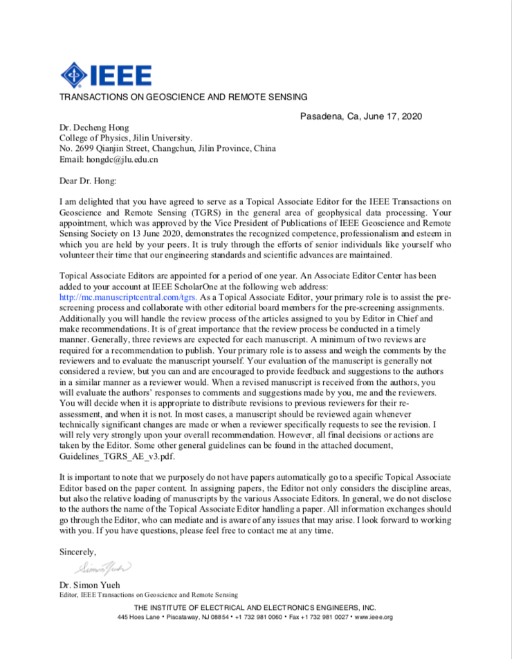 近日,我院洪德成教授被美国电气和电子工程师协会 (Institute of Electrical and Electronics Engineers,IEEE) 正式任命为旗下学术期刊IEEE Transactions on Geoscience and Remote Sensing(TGRS)副主编。