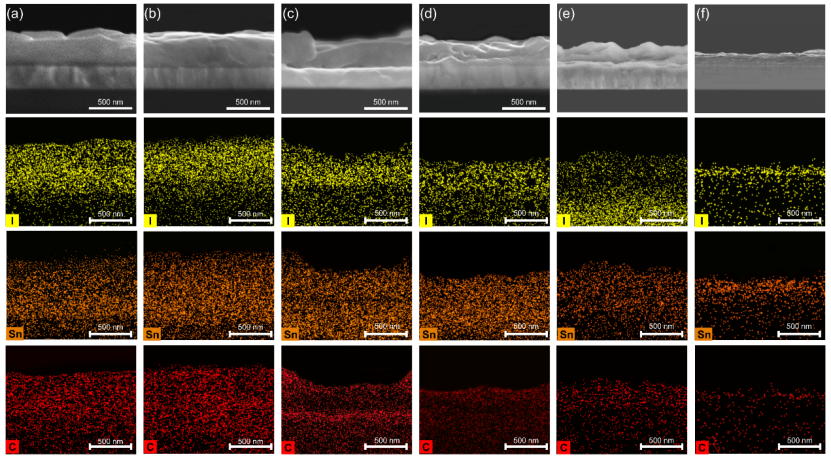 图2. 锡基钙钛矿薄膜在惰性氛围下的光照分解SEM图像及EDS能谱