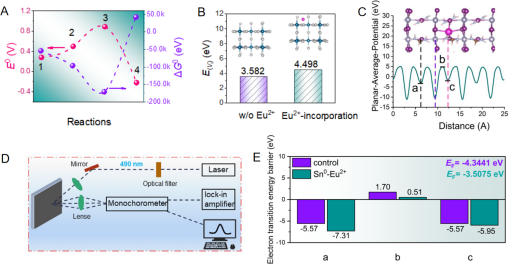 (A) 通过E0和吉布斯自由能ΔG0比较四种可能发生的反应。(ΔG0 = -nFE0,其中n为反应中转移的电子数,F为法拉第常数)。(B)Eu2+掺杂前后VI的形成能。(C)电荷转移过程中各位置平均静电势的计算。其中,a、b和c表示不同位置的静电势:黑色虚线表示电荷通过有FA存在的碘骨架时的静电势;紫色虚线表示电荷通过无机八面体框架时的静电势;玫瑰色虚线表示电荷通过有FA存在的Eu2+结合碘骨架时的静电电位。(D)荧光系统测试示意图。(E)两种情况对应的电荷跃迁势垒。