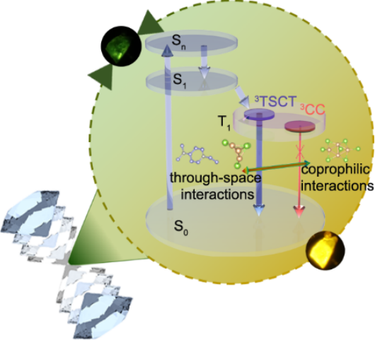 在本工作中,隋永明课题组选择常压下具有TSCT发射特性的Cu4I6(4-dimethylamino-1-ethylpyridinium)2离子型铜碘簇作为范例,利用静水压强直接调制亲铜相互作用和TSCT相互作用。在具有增强的强亲铜相互作用情况下,首次实现了离子型铜碘簇奇异的压致蓝移发射。高压原位XRD和IR表明,在亲铜相互作用和空间相互作用的竞争中,压强驱动了更具优势的TS相互作用,空间相互作用的竞争优势归因于分子间C-H…I新氢键以及增强的范德瓦尔斯相互作用。这种空间作用实现了从阴离子簇核到有机阳离子的离域,产生了主导的3TSCT发射,同时抑制了低能3CC态的形成。理论计算和飞秒瞬态吸收技术给出了相应的激发态弛豫模型,证实了蓝移发射源于更强空间作用下电子离域导致的激发三线态和基态能级间距增加。此工作深化压强调制发光性质的新认知,为设计合成具有TSCT高性能发射材料提供新思路。