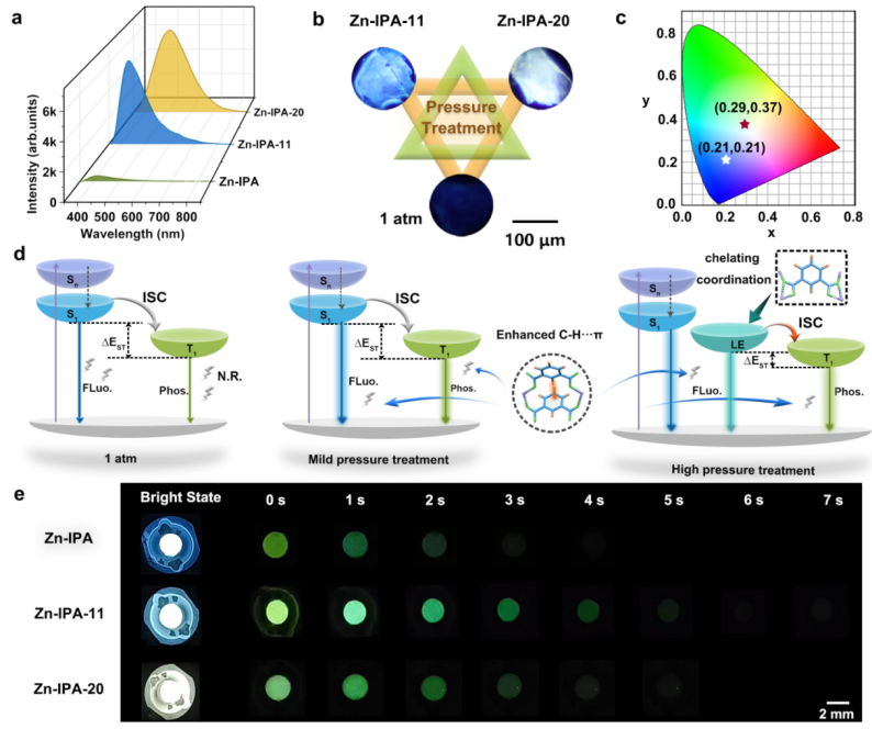 在本工作中,杨新一课题组选择以四配位模式的Zn-IPA MOF作为研究对象,通过压强处理工程定向调控MOFs结构刚性和配位构型,成功在环境条件下提高其系间窜跃效率,将磷光量子产率从7.7 %提高到37.5 %;实现高效荧光/磷光混合型白光发射,量子产率(PLQY)从初始的20.9 %显著提高至81.3%。原位高压紫外-可见光吸收光谱、红外吸收光谱、同步辐射X射线衍射和密度泛函理论计算表明:(1)压强处理工程能够诱导Zn-IPA由对称-反对称侨联配位转变为金属-配体不对称螯合配位,使其发生电子结构相变,产生新的电子态。该电子态能够有效降低单重态和三重态之间的能隙差∆EST,从而加速Zn-IPA的系间窜越过程,提高磷光发射效率,最终平衡单重态和三重态激子的布居,实现荧光/磷光混合型白光发射。(2)压强处理工程能够增强Zn-IPA分子间C-H···π相互作用,提高其结构刚性,进而抑制单重态激子和三重态激子的非辐射能量耗散,提高Zn-IPA发射效率。(3)不同程度的压强处理能够定向调控Zn-IPA的结构刚性和配位构型:较低的压强处理(~11 GPa)能够增强Zn-IPA的结构刚性,截获PLQY为87.0 %的明亮蓝光发射;较高的压强处理(~20 GPa)能够在增强Zn-IPA结构刚性的同时,截获金属-配体不对称螯合配位,从而在环境条件下实现高效荧光/磷光混合型白光发射。本工作利用不同程度的压强处理工程将高效荧光/磷光态“定向截获”至常压,为环境条件下高效多色编码材料的设计和开发提供了新策略。