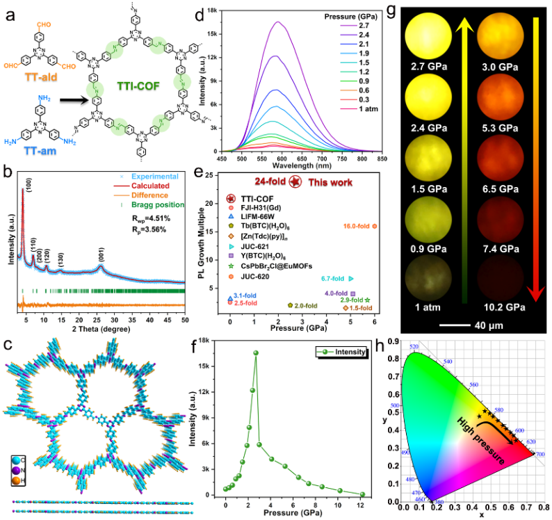 在本工作中,杨新一课题组选择初始荧光较弱的三嗪三苯基亚胺COF (TTI-COF)作为研究对象,通过压强工程实现了明显的荧光增强。与初始状态相比,在2.7 GPa实现了24倍的黄光增强,超过了迄今为止其他具有压强诱导荧光增强(PIEE)行为的晶体多孔材料。相应的荧光量子产率从初始的3.3%提高到71.6%,这是首次在二维COFs材料中实现了PIEE。此外,在1atm到 10.2 GPa的压强范围内,TTI-COF表现出明显的从暗黄色到红色的压致变色行为。原位高压红外吸收光谱、拉曼光谱、瞬态吸收光谱和密度泛函理论计算表明:压强工程有效的限制了C-H键和C-N键的振动,促进了π−π偏移堆叠构型的形成。这有效地抑制了非辐射跃迁,实现TTI-COF的明亮黄光发射。在此过程中,带隙减小和分子间相互作用的增强导致其发射红移。我们的研究为设计具有高光致发光性能的二维COFs材料提供了全新的思路。