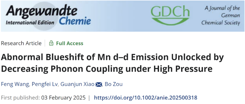 高压与超硬材料全国重点实验室的肖冠军教授在锰(Ⅱ)离子(Mn2+) d-d跃迁发光的高压调控研究中取得了重要进展。通过设计具有较高内部应力的MnS@CdS核壳结构,实现了Mn2+离子发光在更高压强条件下的反常蓝移转变,为更全面、深入理解Mn2+离子发光的背后物理机制提供了新见解。相关研究成果以“Abnormal Blueshift of Mn d–d Emission Unlocked by Decreasing Phonon Coupling under High Pressure”为题发表在《Angewandte Chemie International Edition》上。
