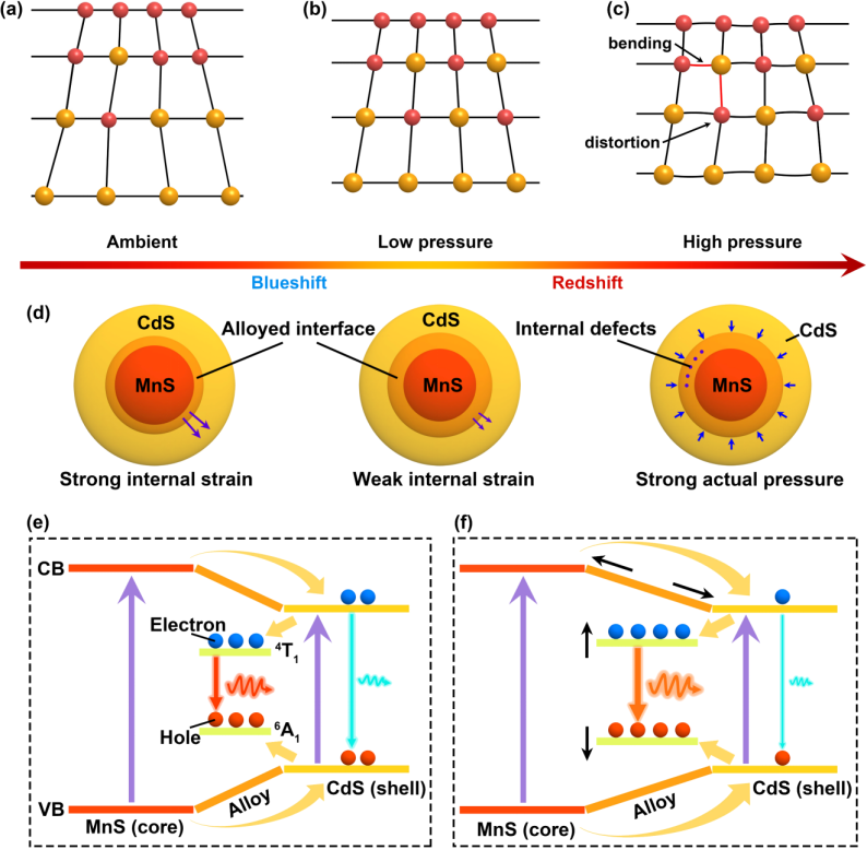 图2. (a-c)不同压力下核壳界面处的压缩过程示意图。(d)高压下核壳界面处合金层的演变过程。(e, f) MnS@CdS量子点在环境条件和2.1 GPa下的电子能级示意图。