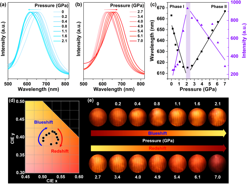 图1. (a-b) MnS@CdS量子点在不同压力下的归一化荧光光谱。(c)高压下荧光波长和强度的变化。(d)不同压力下荧光色度坐标。(e)高压下MnS@CdS量子点的光学显微照片。