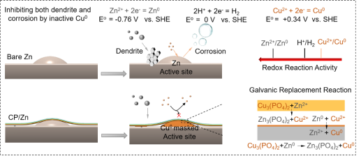 基于此,该论文提出了一种基于电化学置换反应的超薄疏水磷酸铜膜保护策略。该策略巧妙地利用铜离子较高的氧化还原电位,通过电化学置换选择性地在锌负极的晶界、凸起等高活性位点形成电化学惰性的铜沉积层,从而有效屏蔽了这些易发生腐蚀和枝晶生长的位置。此外,磷酸铜膜表面还具有独特的疏水特性,能够显著降低界面水分子活性,进一步抑制副反应的发生。基于该保护膜的锌负极在10 mA cm-2的电流密度下实现了长达11000圈的稳定循环,库仑效率高达99.98%。此外,还成功构筑了容量高达1.2 Ah的锌-碘软包电池。此项研究为高性能锌负极的设计提供了新的界面调控思路。