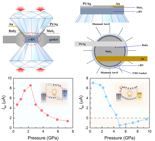 基于肖特基结的光电器件在零偏压下能展现出独特的自驱动特性,甚至可通过外部信号调控实现光响应极性切换等罕见物理现象,因其广阔的科学与工程应用前景而备受关注。除器件物理构型外,光敏半导体的本征特性对器件性能具有决定性影响。探索有效调控策略以增强光敏半导体的本征特性,从而进一步优化器件性能乃至实现光伏极性切换,将极大提升器件的功能与应用。作为一种有效的外部刺激,压力可以有效调控光敏半导体的晶体结构与电子性质,进而实现对其光电特性的有效控制。此前,团队发现通过压力调控能带结构可使Pt/SbI3/Au器件的光响应获得明显增强 (Adv. Optical Mater. 2024, 12, 2401433),这充分展现了高压在光电器件优化中的独特优势。值得注意的是,多种层状过渡金属硫化物(TMDs)在高压条件下均表现出显著的光电性能提升。这类材料(尤其是MoS2)突出的压力敏感性与卓越的光学特性,使其成为高压下高效多功能光电器件探索的理想载体,并有望为相关领域带来新的突破。