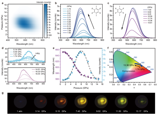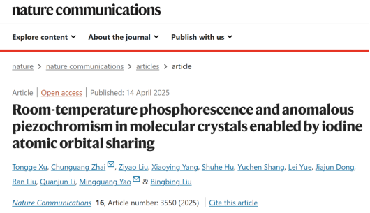 高压与超硬材料全国重点实验室刘冰冰、姚明光教授等人通过高压调控二碘四氟苯(1,4-DITFB)分子晶体中碘原子与近邻分子的“轨道共享”,首次在该体系中实现了压强诱导从无到有、蓝移增强和寿命延长的室温磷光(RTP)发射。相关成果以“Room-temperature phosphorescence and anomalous piezochromism in molecular crystals enabled by iodine atomic orbital sharing”为题发表在国际权威学术期刊《Nature Communications》上。