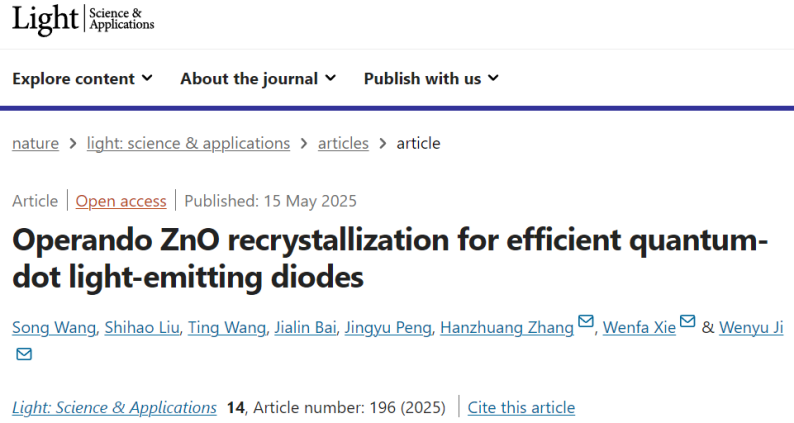 量子点发光二极管(QLED)在显示和照明领域展现出广阔的应用前景。尤其是氧化锌纳米颗粒(ZnO NP)作为电子传输层(ETL)在器件中的引入,极大的提高了QLED的性能,包括效率、亮度及工作寿命。然而,ZnO在QLED的商业化应用中面临许多挑战。其中最为关键的挑战来自于所谓的“正老化”效应。“正老化”效应是指QLED器件在制备完成后,经过一定时间存放或低电压驱动,器件效率不断上升最终趋稳的现象。这种“正老化”效应积极的一面是使得QLED器件获得最佳的性能,消极的一面是其不可控性。这种不可控性使得QLED阵列难以获得一致的器件性能。目前,QLED的这一“正老化”效应的物理机制尚未明确。
