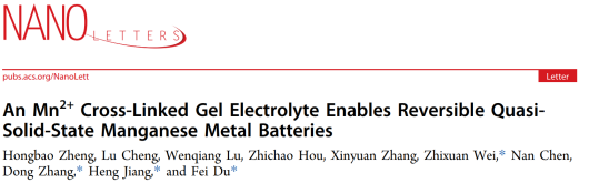 新型电池物理与技术教育部重点实验室杜菲教授团队在水系锰金属电池研究方面取得重要进展,相关成果以“An Mn2+ Cross-Linked Gel Electrolyte Enables Reversible Quasi-Solid-State Manganese Metal Batteries”为题发表在《Nano Letters》上。