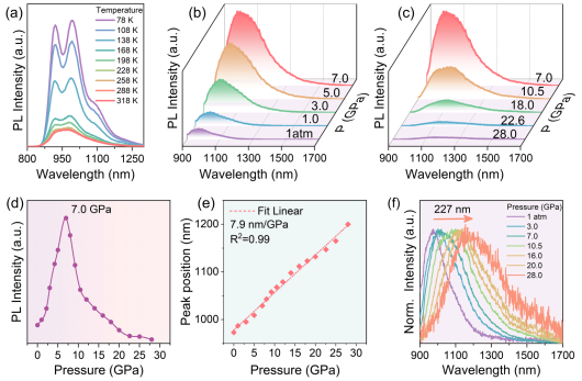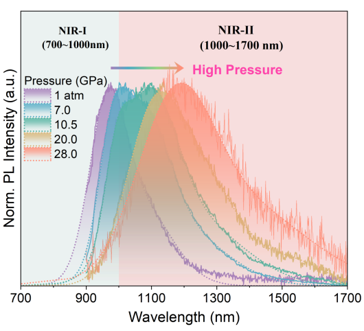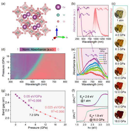 近红外区发光材料在生物医学成像和光学传感等领域具有巨大的应用潜力,然而其实际应用常受到发射波长较短、发光效率较低以及发射光谱较窄而易被非靶向生物组织吸收等限制。在本工作中,肖冠军教授等人对无铅的环境友好型材料Cs2WCl6施加压强,对其发光性质进行有效调制。研究发现,在7.0 GPa的压力下,材料在NIR-II区内的发光强度实现了近一个数量级的显著增强。随着压力的进一步增加,其发光峰位发生高达227 nm的显著红移,从而将Cs2WCl6的发射光谱从NIR-I区连续调制到NIR-II区。