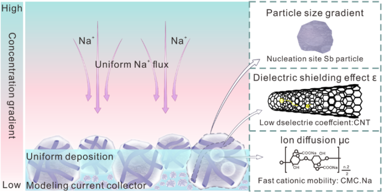 钠离子电池(Sodium-Ion Batteries, SIBs)凭借钠资源储量丰富和成本低廉的优势,被视为智能电网储能系统的重要发展方向。然而,钠的原子质量较高,导致其能量密度普遍低于160 Wh kg⁻¹,难以满足如电动汽车和电动船舶等对高能量密度有严格要求的应用领域。此外,传统SIBs通常需使用过量的负极材料,极大地降低了电池的能量密度。无负极钠金属电池通过舍弃负极材料大幅度提升电池的能量密度。其工作原理为:在充电过程中,正极中的钠离子直接在集流体(如铜箔)表面通过电化学反应沉积钠金属作为负极。但该体系面临严峻挑战:钠金属的高反应活性、剧烈的电极体积变化,特别是不可控的钠枝晶生长等问题,导致无负极电池的循环寿命急剧下降,只能循环几十圈。更为关键的是,目前集流体设计策略普遍缺乏深入的理论指导,这严重制约了无负极钠金属电池的实用化进程和进一步发展。
