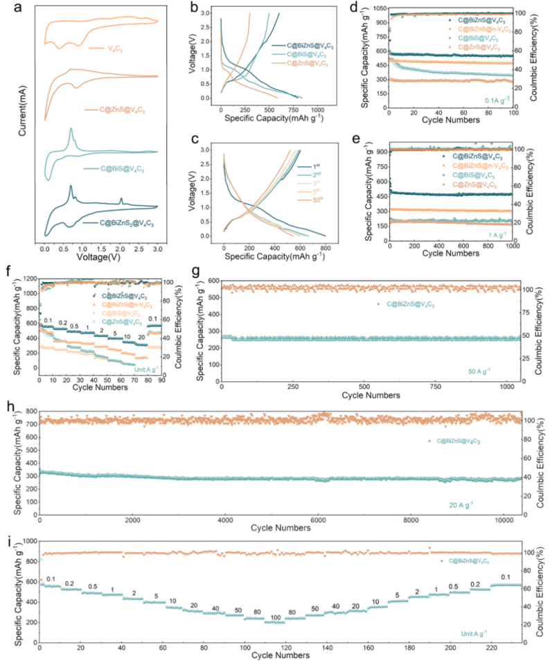 该双重功能机制使 C@BiZnS@V₄C₃复合材料 在 100 Ag⁻¹下展现出 270.4 mAh/g 的比容量,并在 20 Ag⁻¹下保持了超过 10,000圈 的卓越耐久性。这些结果验证了 CEB概念 是实现钠离子电池高能量存储容量与快速充放电性能的创新方法。