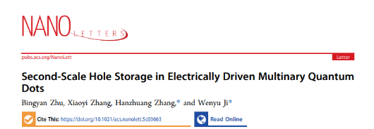 纪文宇教授和张汉壮教授等人制备了基于Cu-In-Zn-S(CIZS)量子点的电子发光器件,并系统地探究了影响其空穴储存的关键因素,通过瞬态电致发光(TrEL)和瞬态光致发光(TrPL)等表征,揭示了基于CIZS量子点器件中的电荷分布及工作机理。研究表明,在脉冲电压的激励下,该器件的TrEL响应在上升沿与下降沿分别表现出显著的电致发光过冲和尖峰现象,这一独特特征源于器件内部的电荷存储效应。该性能的获得主要归因于两方面:其一,CIZS量子点中Cu相关缺陷态能级形成局域态,有效延长了空穴驻留的时间;其二,合理的器件结构设计进一步强化了空穴限制效应,即选用更深HOMO能级的BCBP作为空穴传输层(HTL)抑制空穴回迁,同时在HTL中插入约为3 nm厚的PPT薄层,利用其较低的LUMO能级和自发取向极化特性,能够有效俘获泄漏的电子,从而进一步提升器件的空穴存储。此外,该文章还系统探讨了器件中电荷存储效应对脉冲驱动参数的依赖关系及其影响机制。研究发现,适当延长脉冲驱动时间(tw)及提高反向驱动电压(VR)有助于增强量子点中空穴的存储效应与剩余载流子的提取效率,从而显著提升器件的“读取”能力。基于该独特特性,本文构建了一种基于常规QLED的写入–读取工作模式。器件实现了长达0.8秒的空穴存储时间,为QLED开辟新的工作模式和应用前景,特别是在防伪识别等对高密度存储与响应延迟具有特殊需求的场景中展现出潜力。相关成果以“Second-Scale Hole Storage in Electrically Driven Multinary Quantum Dots”为题目,发表在Nano letters期刊上。