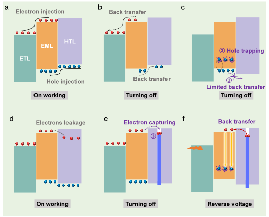 量子点发光二极管(QLED)作为新一代显示与照明技术的关键器件,正引起学术界与产业界的高度关注。随着研究的深入,QLED凭借其快速光响应能力与可调发光特性,可实现光学写入、读取以及多级编码的功能,具备集成传感、存储与显示功能的潜力。而QLED实现写入/读取功能的核心在于电荷的有效存储与载流子的积累、提取以及再复合过程。因而,实现其类存储器功能的关键在于对电荷储存及后续提取复合行为的有效调控。因此,深入理解并调控其内部的载流子动力学过程尤为关键。