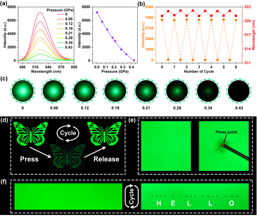 具有快速响应能力的智能材料是当前技术创新的新质生产力。其中,压力响应材料因具备响应快、控制精度高和能耗低等优势而备受关注。与静态压力响应材料相比,动态压力响应材料稳定性较差且研究成本较高,极大制约了其在工业监测中的广泛应用。前期研究中,课题组在Cs4PbBr6钙钛矿纳米晶中首次实现了压强诱导发光(PIE)(Nat. Commun. 2018, 9, 4506),并不断拓展了系列压力诱导发光材料;通过构筑空间位阻等提高相变势垒,截获高压亚稳相,进而将高效发光高压相稳定至常压存在,极大地促进压强诱导发光从基础研究迈向实际应用。与此同时,往往忽略了快速压力猝灭亦可应用于压力灵敏开关。