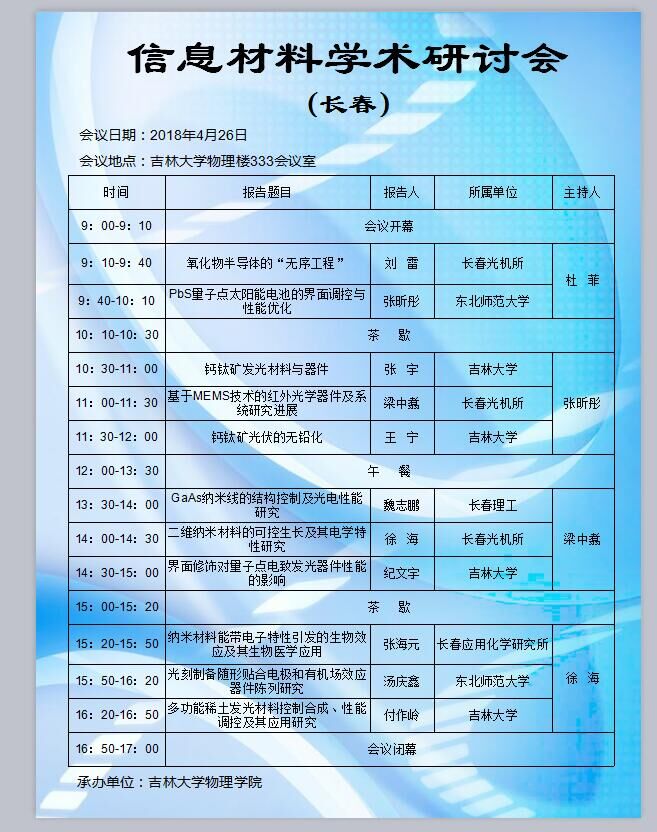 由蜜桃视频 主办的“信息材料学术研讨会”将于2018年4月26日在蜜桃视频 物理楼333会议室举行。本次会议旨在促进学院广大师生在物理相关领域的研究及交流,提高我院教师科研水平、科研能力。会议邀请中国科学院长春光学精密机械与物理研究所、中国科学院长春应用化学研究所、东北师范大学、长春理工大学等高校及科研机构的多位知名专家学者参加。欢迎广大师生积极参与!