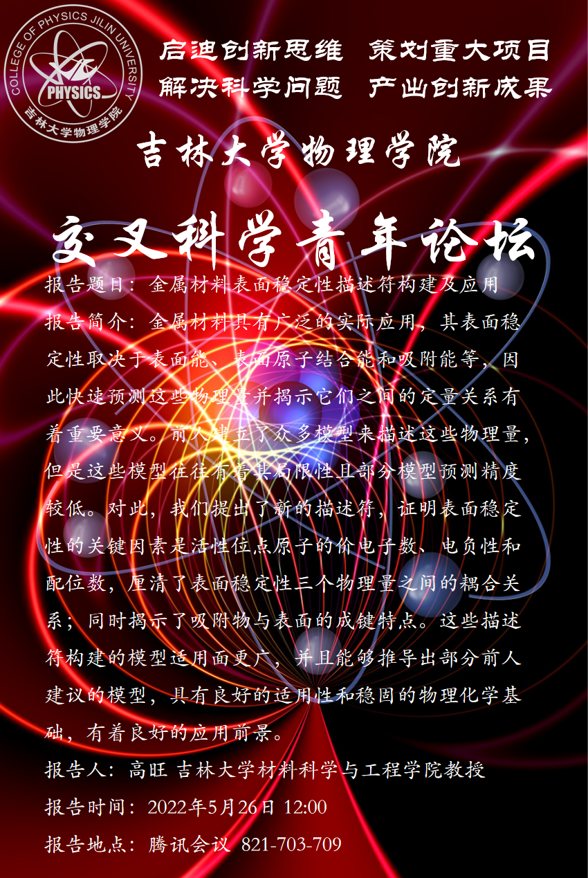 报告题目: 金属材料表面稳定性描述符构建及应用