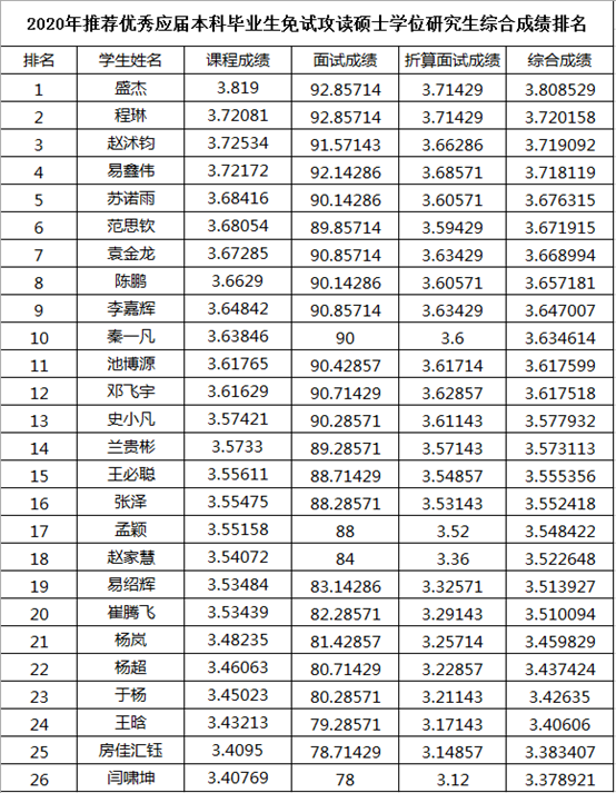 根据《蜜桃视频 推荐优秀应届本科毕业生免试攻读硕士学位研究生工作管理办法》(校发[2019]48号)、《蜜桃视频 2020年推荐优秀应届本科毕业生免试攻读硕士学位研究生工作细则》文件规定,现将蜜桃视频 2020年推荐优秀应届本科毕业生免试攻读硕士学位研究生面试成绩和综合成绩排名予以公示。