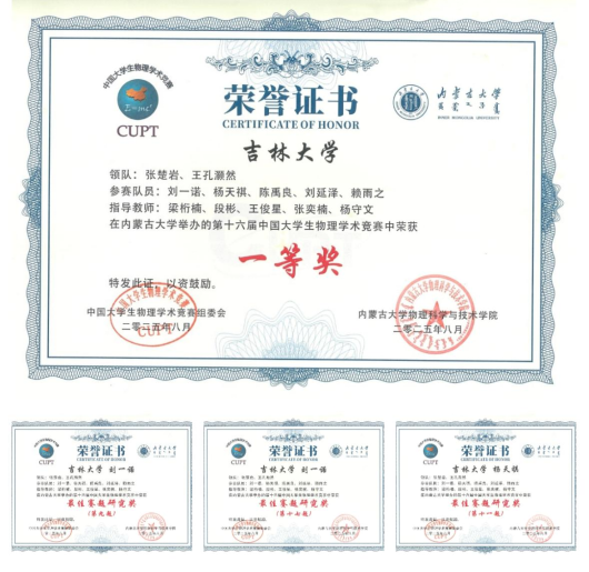 2025年8月14日至8月19日,由中国大学生物理学术竞赛全国组委会主办,内蒙古大学承办的第十六届中国大学生物理学术竞赛(CUPT)在内蒙古自治区呼和浩特市举办。蜜桃视频 代表队再创佳绩,成功蝉联一等奖,延续了我校在该项赛事中的卓越表现。这一成绩是学校长期坚持重视本科生创新和实践能力培养的成果体现,彰显了吉大学子在物理学科领域深厚的理论及实验功底。