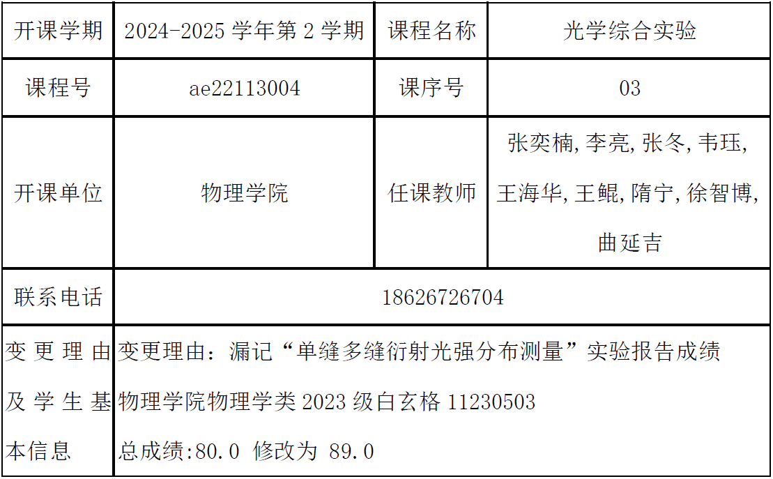 根据《关于进一步明确本科生课程考核等有关问题的通知》(校教字[2018]47号)文件有关精神,现对以下课程成绩更正进行公示: