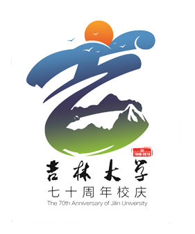 70周年校庆徽标主体取形于中国书法“吉”字。背景色为白,主体色为金、蓝、绿、红。设计元素形意结合,源自校徽、校歌、校园建筑和吉大精神。