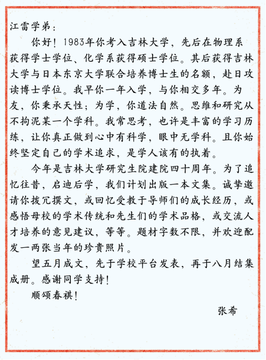 收到校长情真意切的邀请函,记忆已经飞回那熟悉的校园,我欣然应约,共书《闻雁集》。吉大于我,是生地、是乐园、是母校。这里有父母、有恩师、有同学、有故事。诚如校长所述,我学术道路上的成绩,离不开对“道法自然”科学研究的挚爱和对学科交叉的执念。值此研究生院建院四十周年之际,我想留下我的成长故事,与“后辈”们共勉。成功人生的旅程往往是这样的:“不要总想着第一步就踏上人生的金砖,只管大胆地跨出。当你终于踏上属于你的那块金砖的时候,回首一看,原来步步都是金砖!”我愿用这“一路金砖”与你们分享,如果能够给你们的工作和生活以启发,那将是作为“前辈”的最大欣慰。