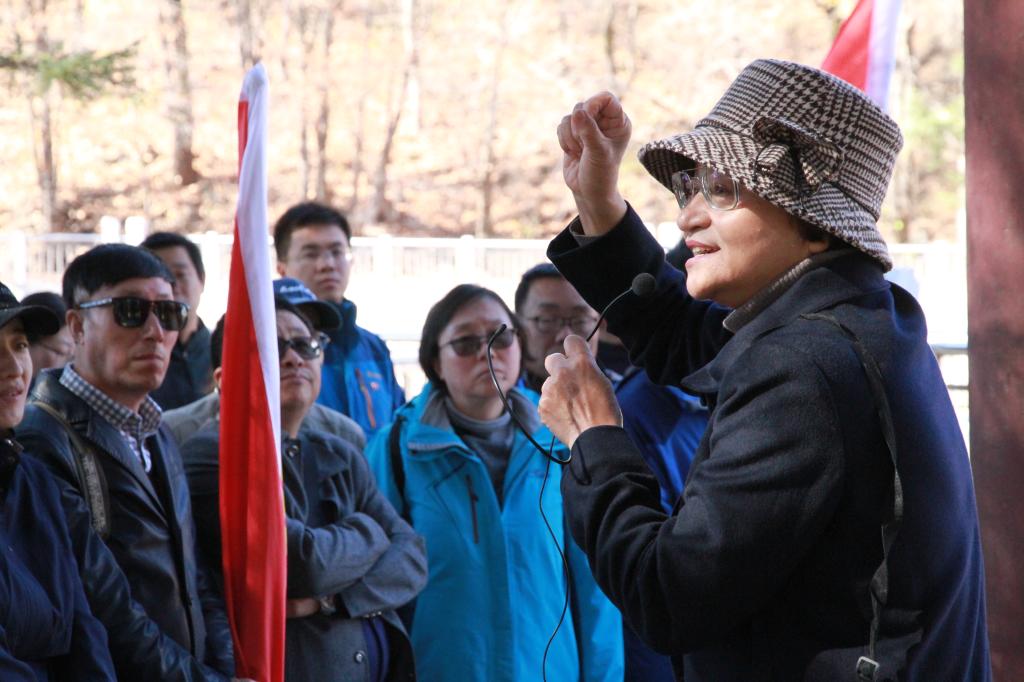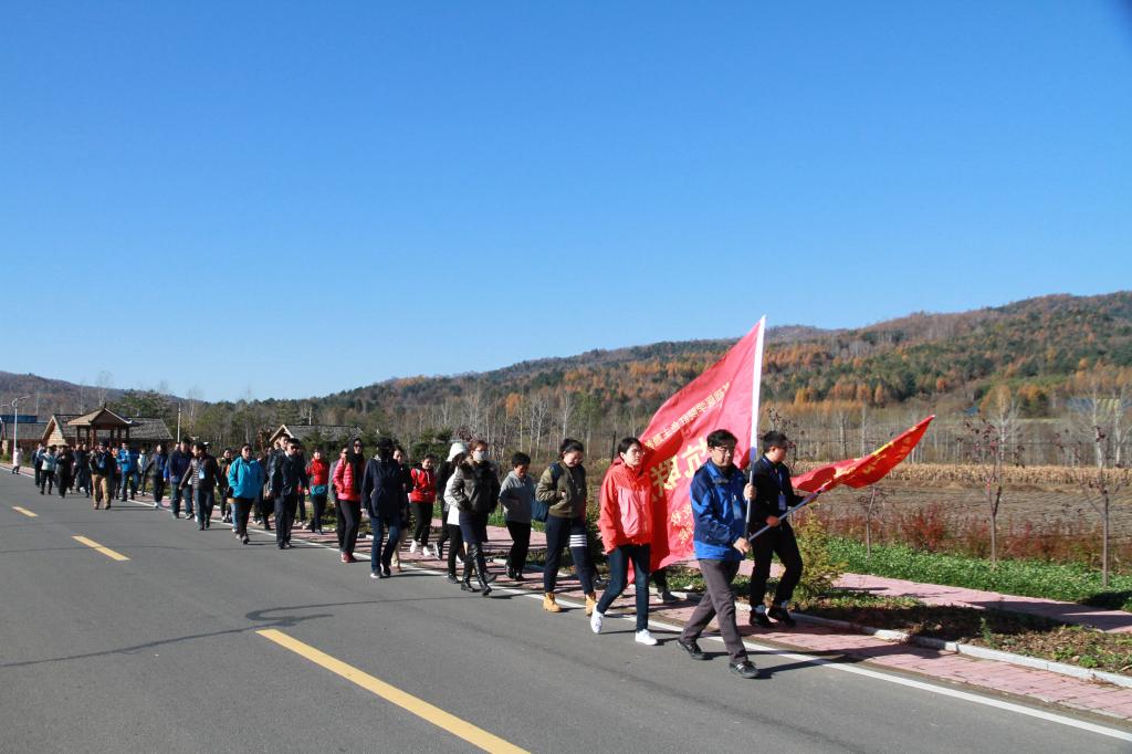 “重走抗联路”活动的第二天在学唱《东北抗联一路军军歌》的激昂歌声中拉开序幕。学员们在秋风中重走抗联路,颂咏抗联诗,体验抗联魂。随后,学员们怀着沉重的心情与崇高的敬意来到靖宇县,在东北抗联总司令、民族英雄杨靖宇将军牺牲的常青树旁聆听了杨靖宇将军最后五天五夜誓死抗争、吞棉饮雪的壮烈事迹。最后,本次培训以重温入党誓词结束。