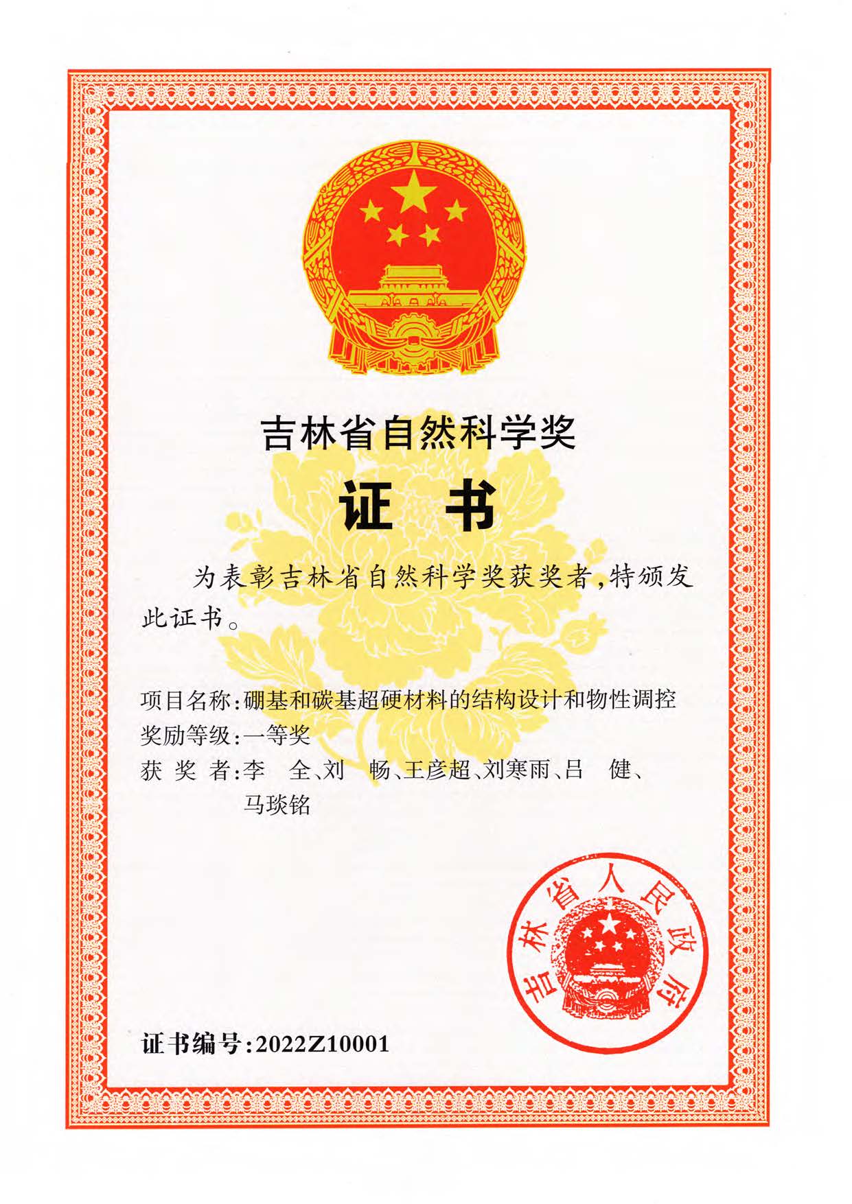 2022129日,吉林省人民政府发布了《关于2022年度吉林省科学技术奖励的决定》。由我院马琰铭教授研究团队完成的“硼基和碳基超硬材料的结构设计和物性调控”项目荣获吉林省自然科学奖一等奖主要完成人:李全刘畅王彦超刘寒雨吕健马琰铭)。