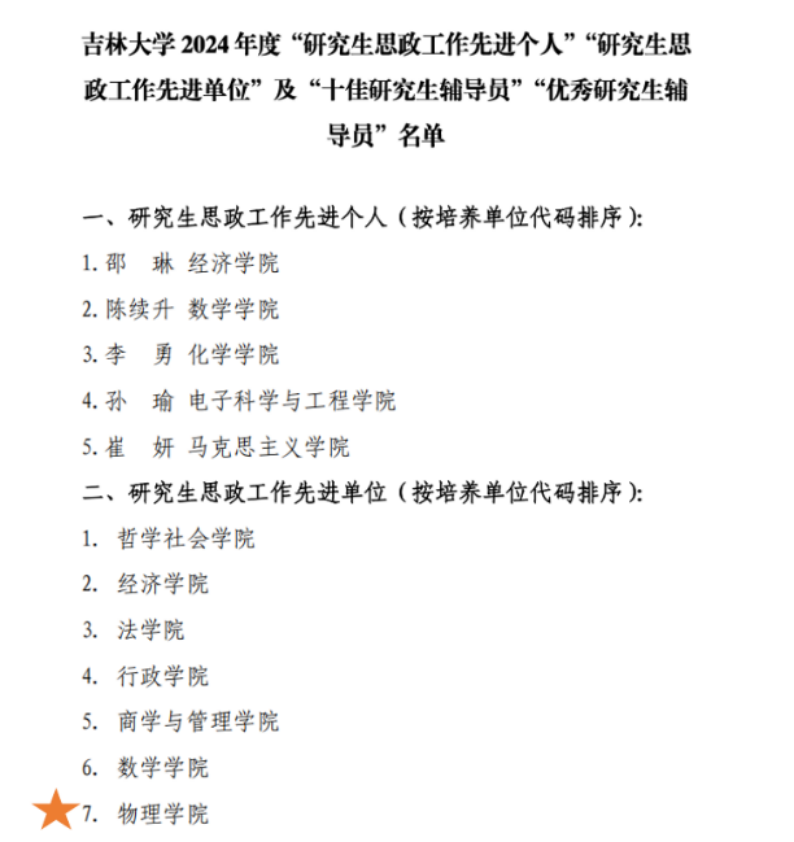 本年度,2021级博士研究生陆文成获“十佳博士研究生”,2021级博士研究生王奎获“吉林省优秀大学生”,2023级博士研究生代政辰等3人获校“优秀共产党员”,2023级博士研究生侯鹏飞入选研究生“青云计划”,2021级博士研究生崔政获“学雷锋标兵”,2022级硕士研究生王乐强等6人获“优秀志愿者”;2019级博士研究生尚宇琛获“第七届蜜桃视频