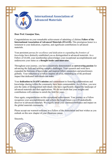 国际先进材料学会(IAAM)是全球先进材料领域著名国际性学术组织,总部设在瑞典,致力于为先进材料科学、工程和技术在世界范围内的快速发展提供高水平学术平台,现已发展成为材料科学领域各类学科领军人才的聚集地,目前拥有来自超过150个国家的10万多名会员。IAAM“终身会士”是全球范围内授予在材料科学、工程和技术领域做出独创性且重要贡献科研人员的殊荣,评选通过专家提名、学术委员评审、学术演讲等环节遴选产生。