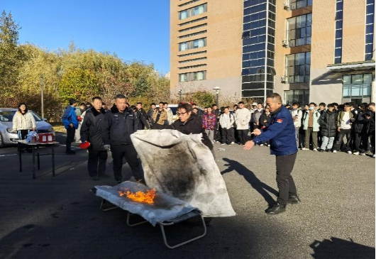 理论知识讲解结束后,实战演练环节随即展开。模拟“浓烟”环境中,参与师生用湿毛巾捂住口鼻,俯身低姿,沿预定路线迅速有序撤离至楼下安全区域。随后,保卫处老师现场讲解并演示了灭火毯、干粉灭火器等常用消防器材的正确使用方法,并指导师生亲手操作。大家踊跃参与,在模拟火源扑救中掌握了初期火灾应对的实际技能,切实提升了应急处理能力。