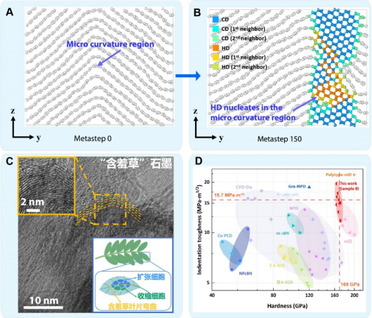 “仿生曲率诱导”的金刚石超硬材料结构设计和实验制备。研究团队从含羞草叶片的曲率响应中获得仿生启发,通过在石墨前驱体中引入微米级曲率结构,实现了应力场的调控和设计,从而主导金刚石的相变路径与界面演化,构建出立方—六方异质结构。该结构有效抑制位错运动并耗散裂纹能量,实现了硬度与韧性的协同提升,为超硬材料的结构设计和可控合成提供了新思路。