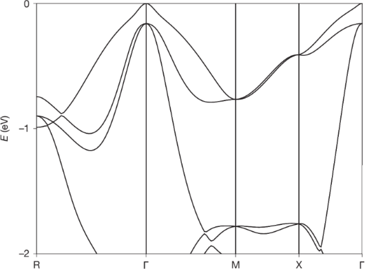 图:立方Cu2O能带结构。注意价带顶附近的能带简并,在Γ–R(对应 [111] 方向)、Γ–M(对应 [110] 方向)和 Γ–X(对应 [100] 方向)远离 Γ 点时,顶部三条能带所呈现的不同色散关系所导致的能带翘曲结构。
