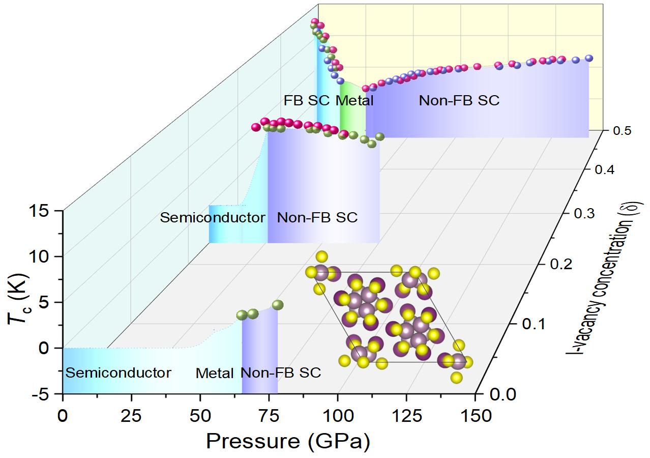 在本工作中,研究团队系统研究了压力与碘空位对Mo4S2I6超导性质的协同调控作用。通过引入碘空位(δ=0.48),成功将材料的超导转变压力大幅降低,并在2 GPa下实现了13.1 K的超导转变温度,这是目前准一维材料中报道的最高超导温度纪录。理论计算表明,碘空位的引入导致能带窄化,并诱发了源于链内相互作用的平带形成,且该效应随空位浓度增加而增强。平带的形成增强了电子间的相互作用,使得超导相能够在远低于无缺陷晶体所需的压力下实现。该研究不仅展示了缺陷工程与压力调控相结合在降低超导所需压力、提升超导温度方面的有效作用,也为理解低维材料中超导的微观机制提供了重要的实验线索与理论依据。
