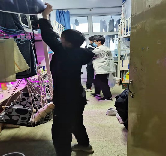 生活管理委员会成员。活动开始之前,生管会在各年级群里对学生们提前告知此次杀菌活动的大致内容以及要求。在内部讨论过后,生管会决定在保护好电子设备及每个宿舍均有人员在场的情况下,工作人员有秩序地对每一间宿舍进行规范化的消毒处理。工作人员们在进行分工后,消毒活动由一楼至六楼同步进行,保证了整个过程的迅速和高效。同时,由于消毒水对身体会造成危害,消毒后的半个小时内,由生管会工作人员先进行通风处理,在确保安全后才让同学们回到自己的宿舍。