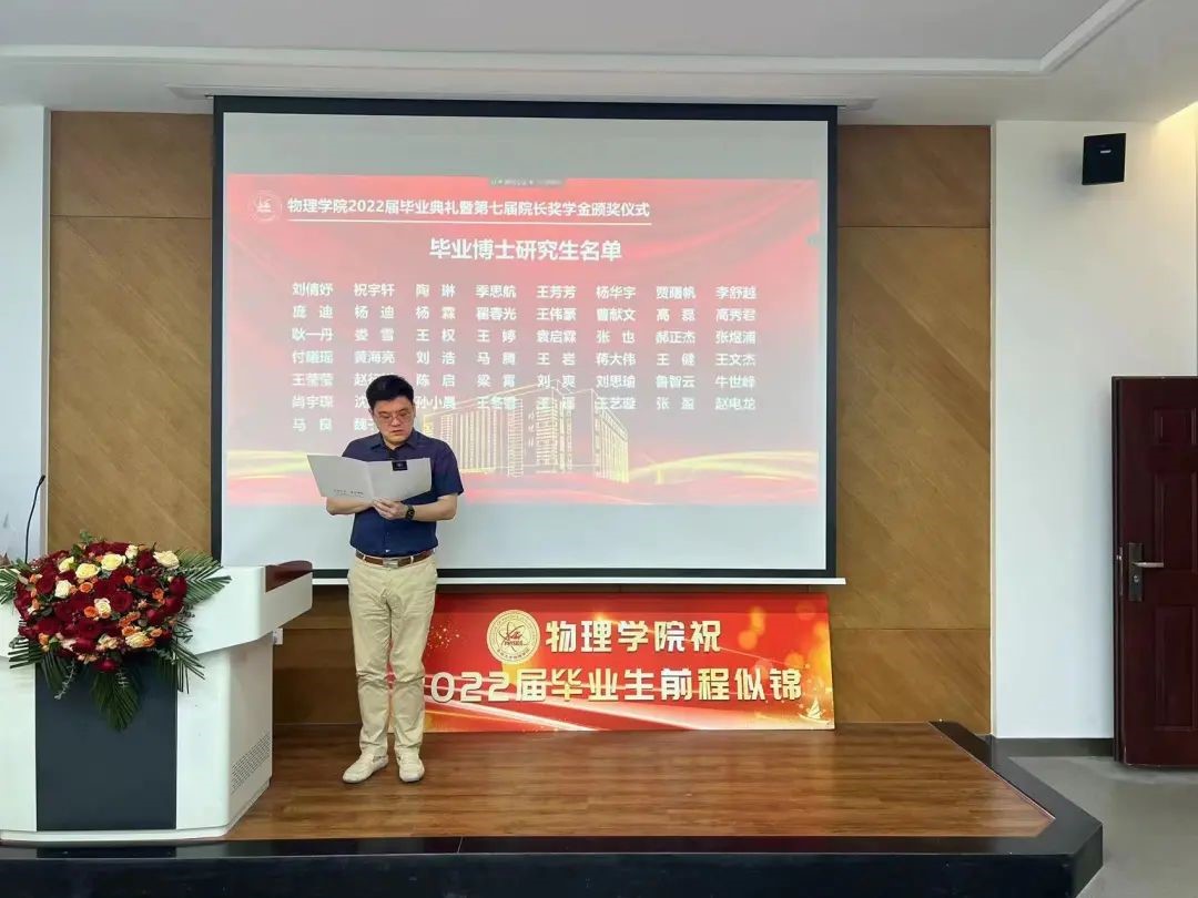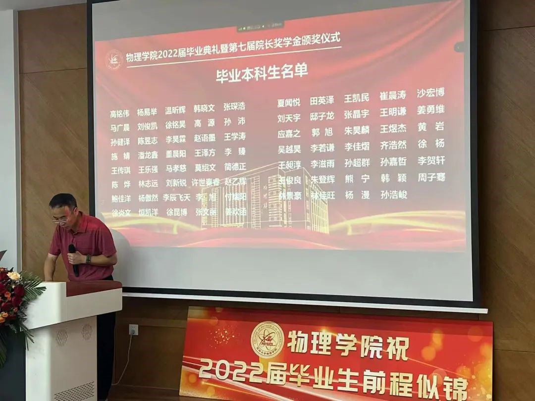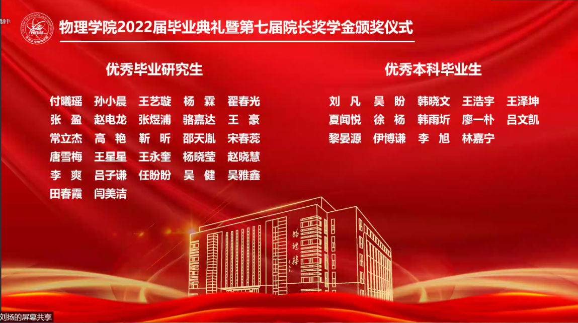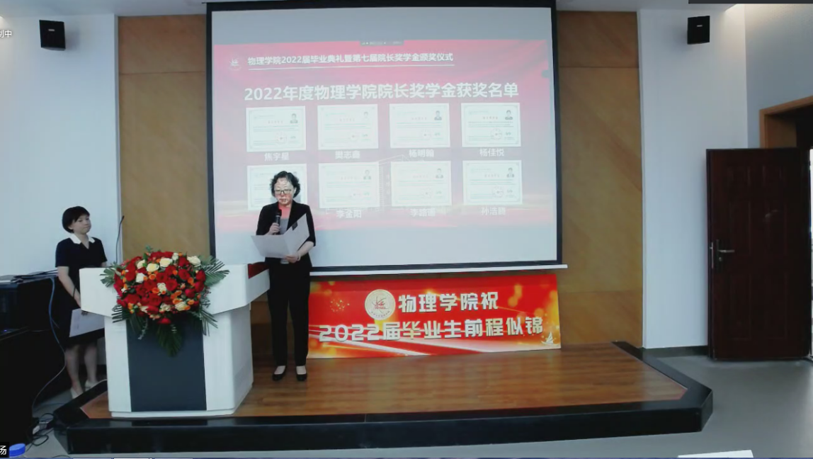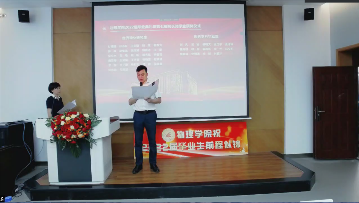 副院长杨景于物理楼参加典礼,各系主任、教师代表及全体毕业生于云端参加典礼。典礼由学院党委副书记兼副院长杨讴菡主持。