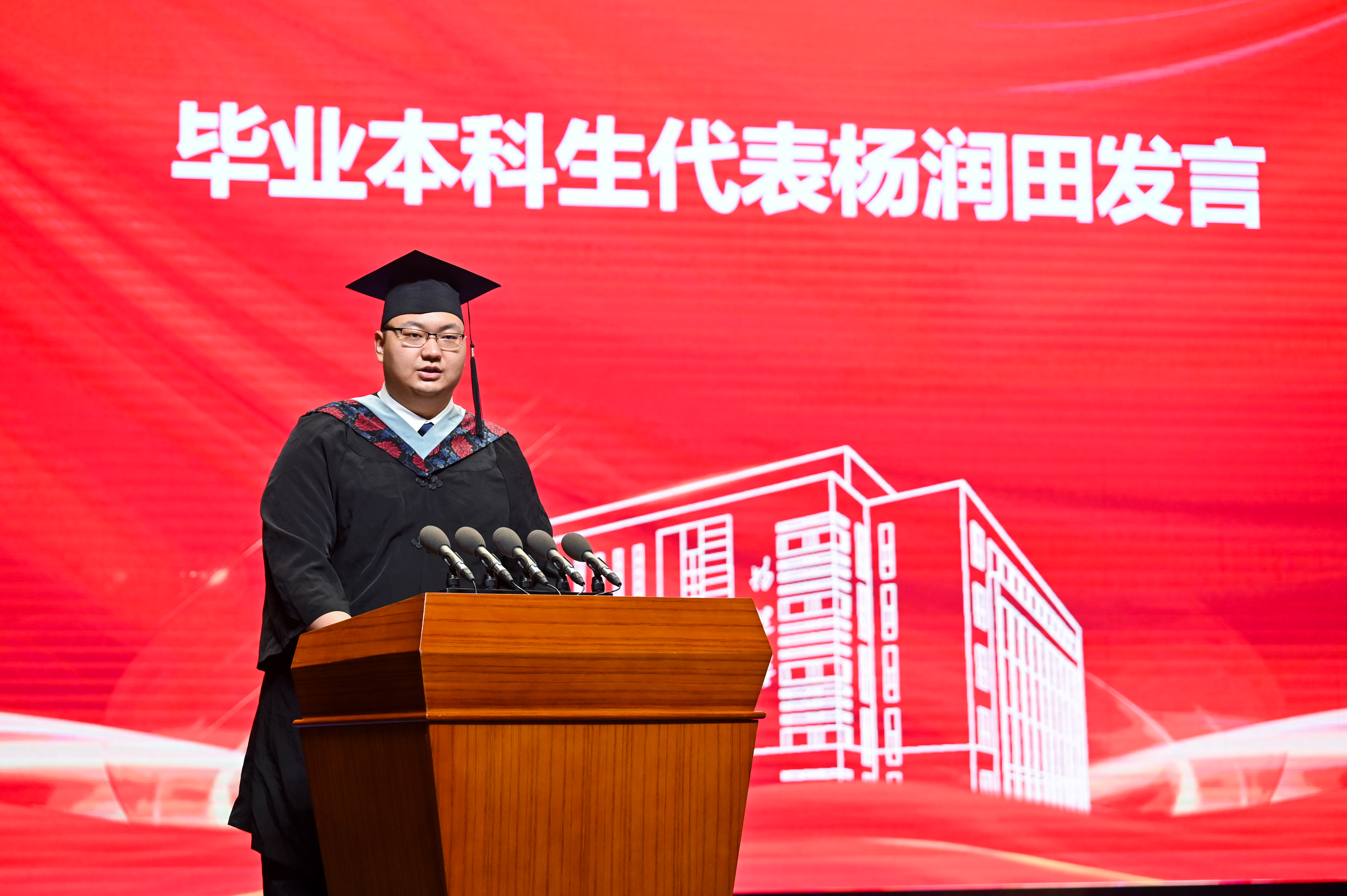 本科生毕业生代表杨润田同学真情实感地表达出对学院、老师、同学的感激之情,并以自身励志的经历鼓励全体毕业生激情拼搏、实现自我。