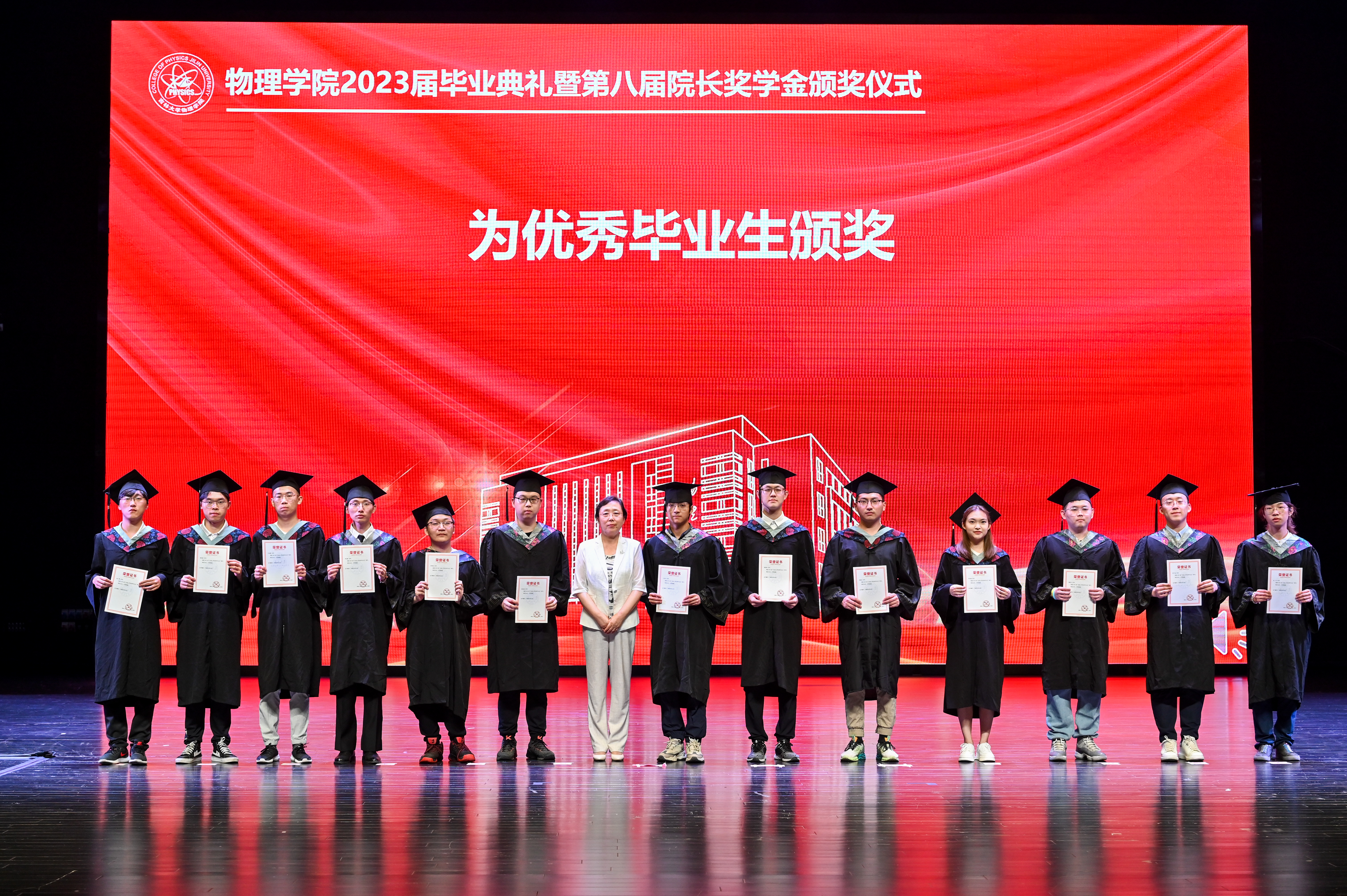 党委书记孟文卓为学院2023届优秀毕业生颁发证书并合影留念。
