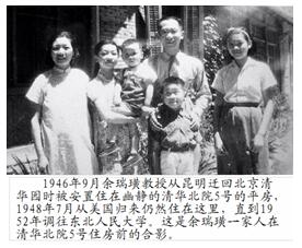 1946年7月清华大学从昆明迁回北京,9月余瑞璜一家人终于回到清华园;被安排住在清华北院5号平房。10月开学,11月5日正式上课。由于当时不少老清华的教师尚未返校,余瑞璜教授承担了极其繁重的教学任务:一年级的普通物理、二年级的理论力学、三年级的光学、四年级的原子物理课他全上,还要兼北京大学物理系、北京师范大学物理系的课,清华金属物理研究所也要搞起来。那时他十分繁忙,但感到生活很充实,愉快。